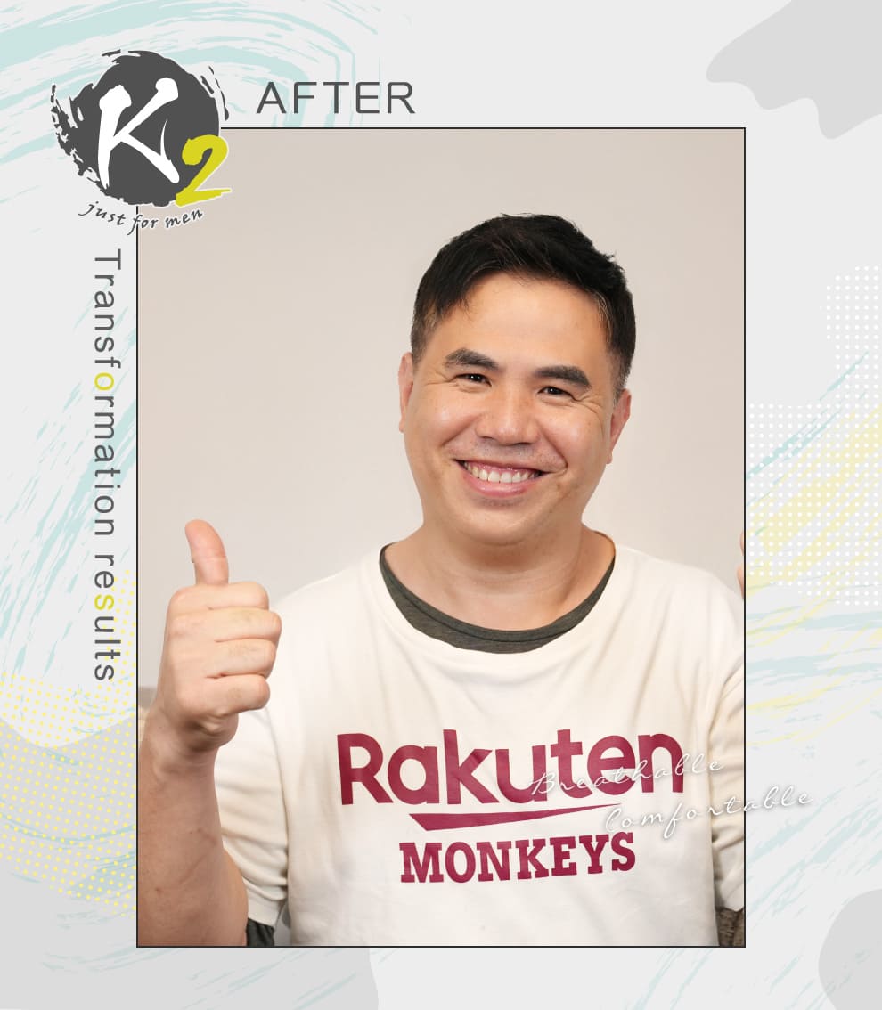 當鏡中的自己出現那熟悉的髮際線,Gino忍不住笑了出來:「就像回到高中時期!」K2髮片輕盈透氣、自然服貼,讓他感嘆:「造型師在修剪的時候,我真的覺得那是我自己的頭髮。」